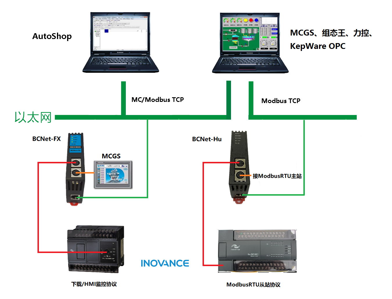 產(chǎn)品簡(jiǎn)介 BCNet-HU是一款經(jīng)濟(jì)型的以太網(wǎng)通訊處理器,是為滿足日益增多的工廠設(shè)備信息化需求(設(shè)備網(wǎng)絡(luò)監(jiān)控和生產(chǎn)管理)而設(shè)計(jì),用于串口通訊參數(shù)配置是Modbus RTU從站的匯川HnU系列PLC的以太網(wǎng)數(shù)據(jù)采集,非常方便構(gòu)建生產(chǎn)管理系統(tǒng)。若匯川HnU系列PLC串口通訊參數(shù)配置是下載/HMI監(jiān)控協(xié)議,則選BCNet-FX。匯川緊湊型EASY系列小型PLC,可選網(wǎng)絡(luò)耦合器BCNet-NAT或BCNet-MB。