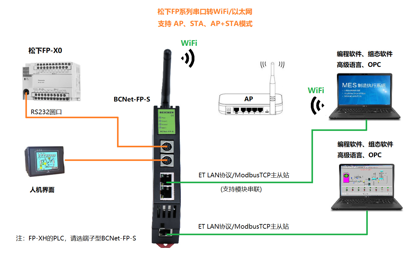 BCNet-FP-S用于松下FP-XH、FP-X、FP-X0、FP0、FP0R、FP2SH系列PLC的以太網(wǎng)數(shù)據(jù)采集,非常方便構(gòu)建生產(chǎn)管理系統(tǒng)。模塊集成WiFi功能,支持AP模式、STA模式和AP+STA模式,帶膠棒和磁吸天線,方便構(gòu)建WiFi網(wǎng)絡(luò),直接通過(guò)WiFi進(jìn)行PLC編程、數(shù)據(jù)采集。