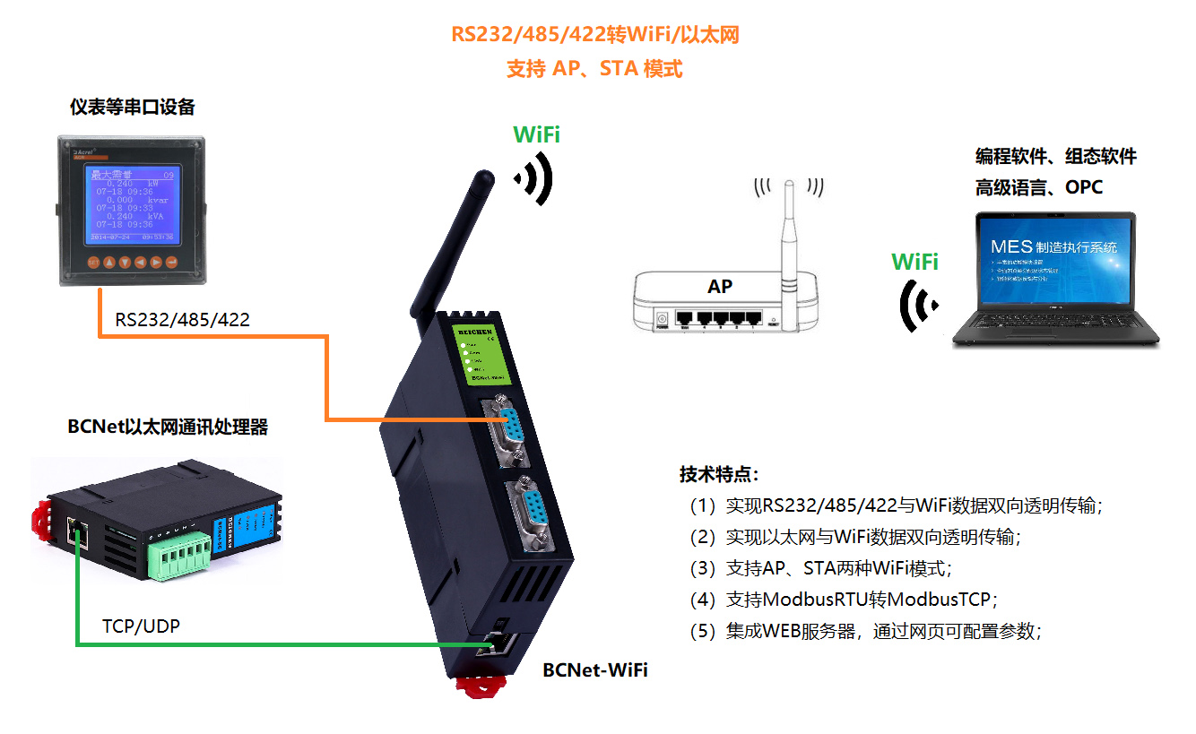 產(chǎn)品簡介 BCNet-WiFi是一款面向工業(yè)領域的,高性能的無線通訊模塊。該工業(yè)無線模塊可以方便地將串口/網(wǎng)口設備連接到WIFI無線網(wǎng)絡,實現(xiàn)串口/網(wǎng)口設備的無線化網(wǎng)絡升級。BCNet-WiFi提供串口轉(zhuǎn) WiFi、串口轉(zhuǎn)以太網(wǎng)、以太網(wǎng)轉(zhuǎn)WiFi功能,能實現(xiàn) RS232/485/422串口與WiFi/以太網(wǎng)的數(shù)據(jù)雙向透明傳輸,特別適合于串口或網(wǎng)口PLC、觸摸屏等工控設備的無線上下載、監(jiān)控和設備聯(lián)網(wǎng)。